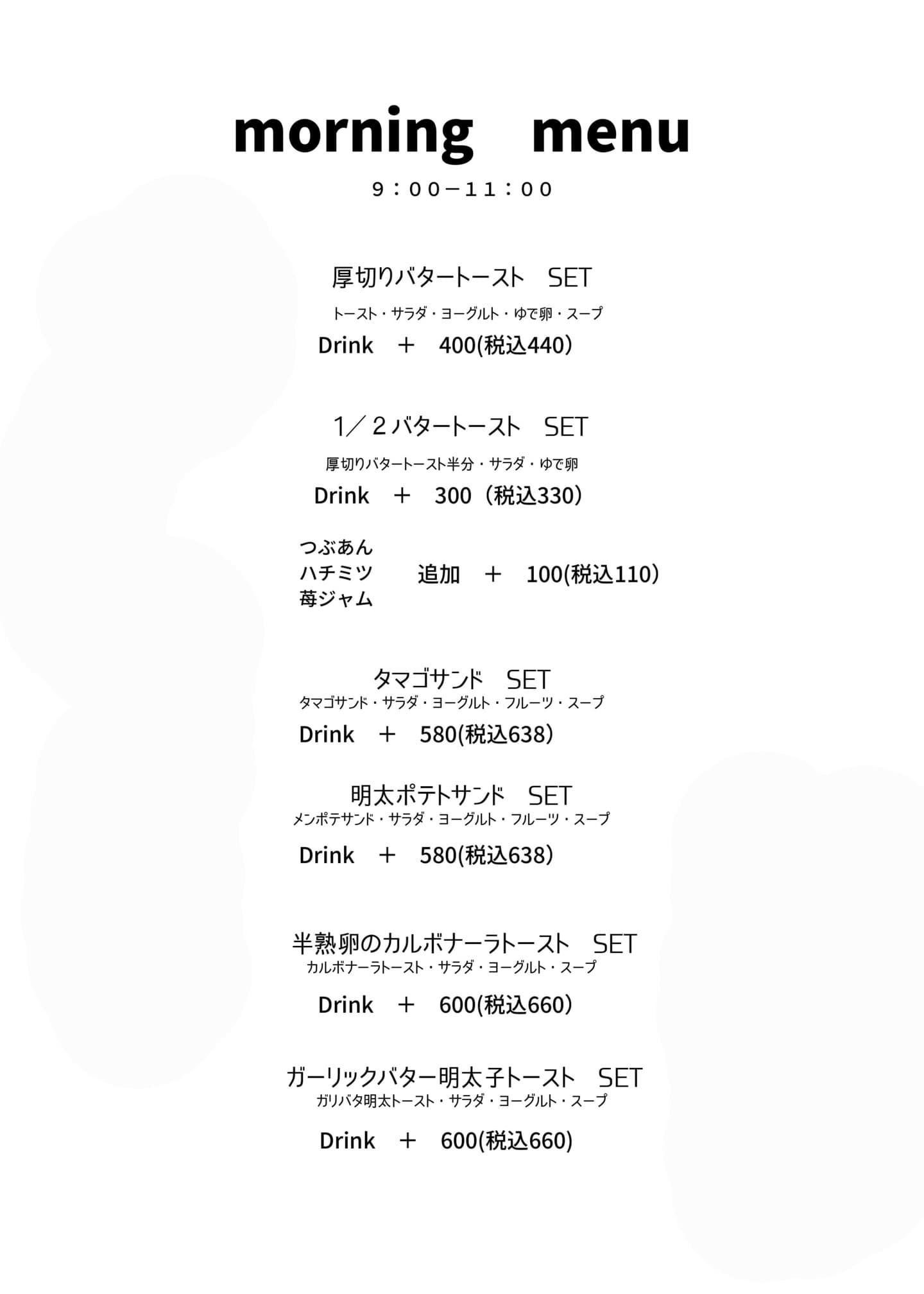 | 営業時間 | [月・水・木・日] 9:00~15:00(L.O.14:00) [金・土] 11:00~15:00(L.O.14:00) 18:00〜22:00(L.O.21:00) ※金・土のみ夜営業あり ※夜営業停止中。再開未定 |